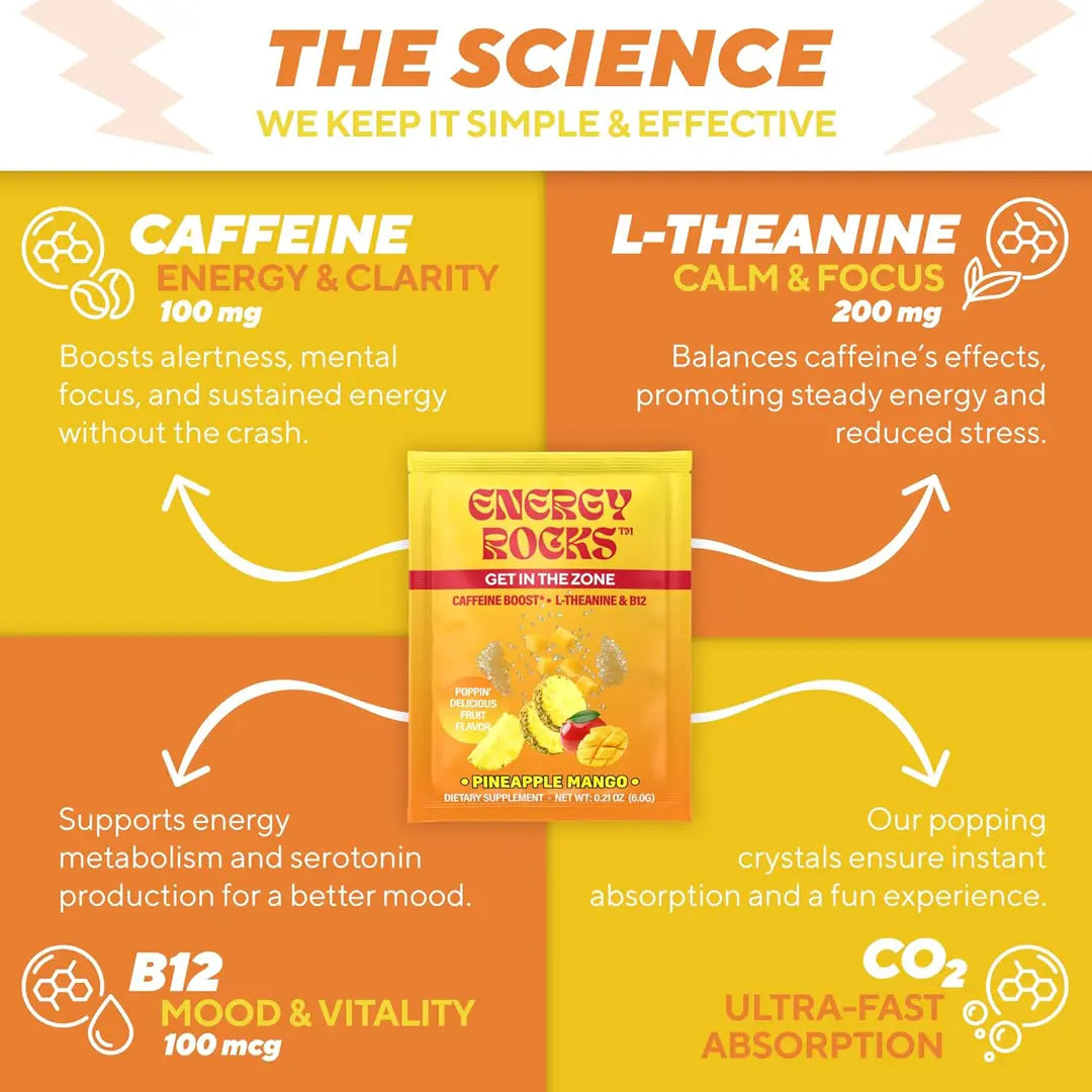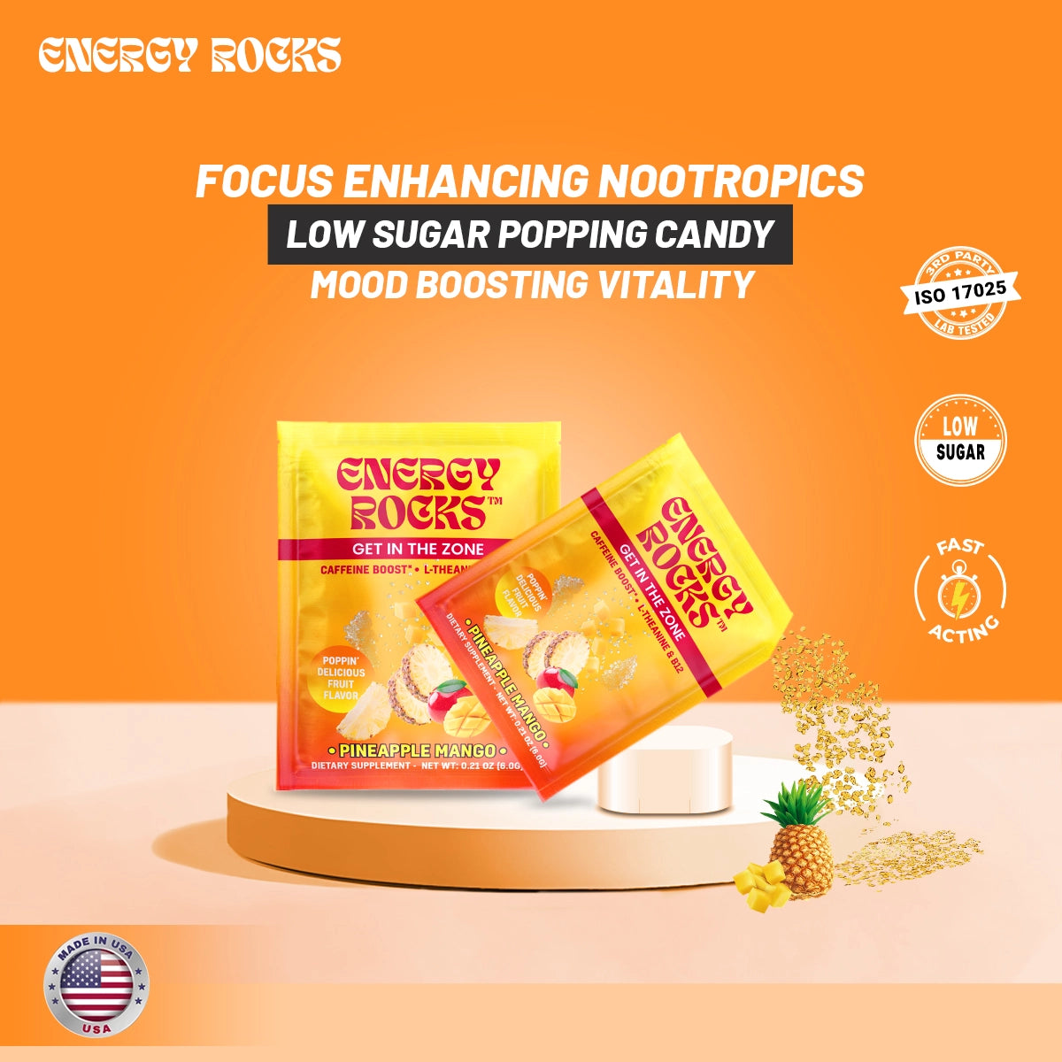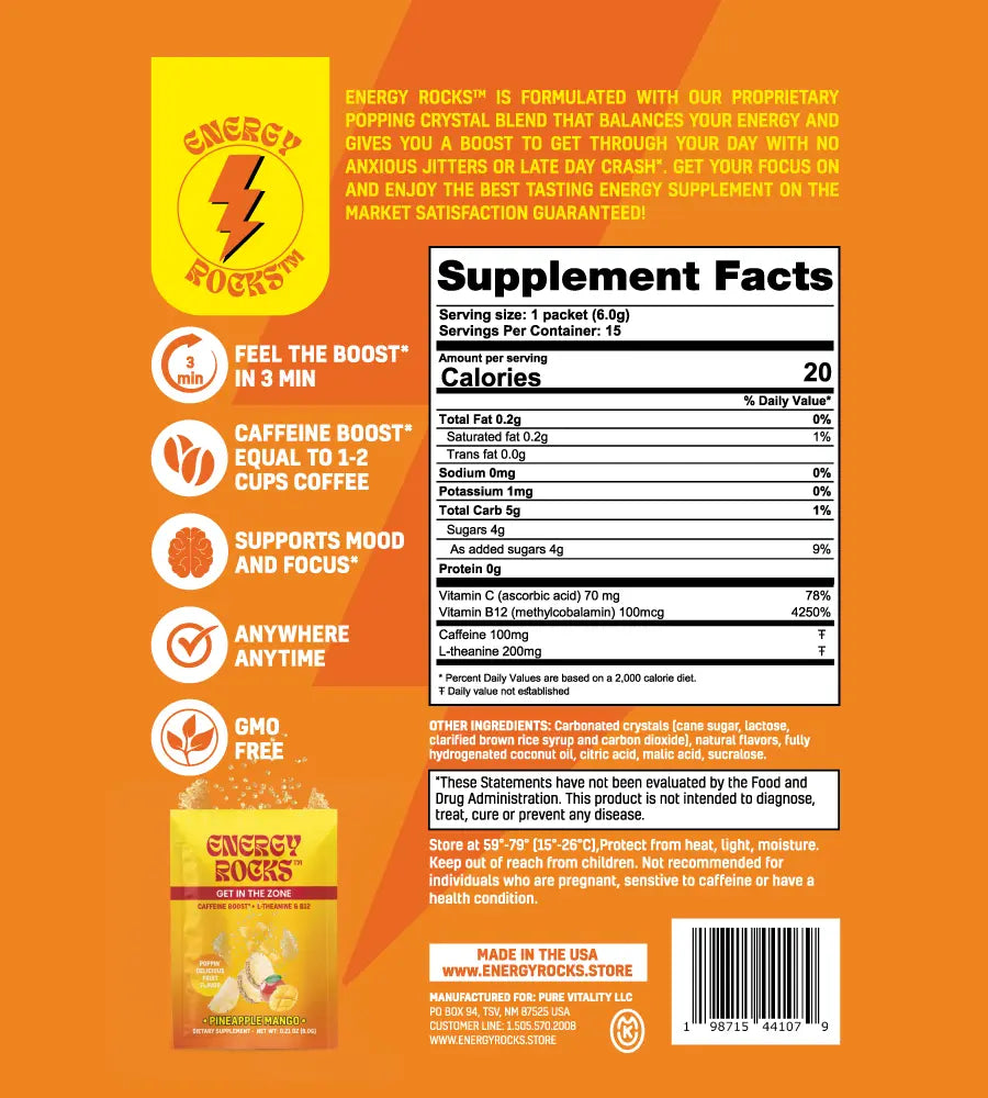 These popping candy crystals are delicious and bring back that fun pop rocks sensation! The pineapple mango flavor is great, and they're super easy to take—no mixing required. I like the quick energy boost from the caffeine and B12, perfect for staying focused during the day.